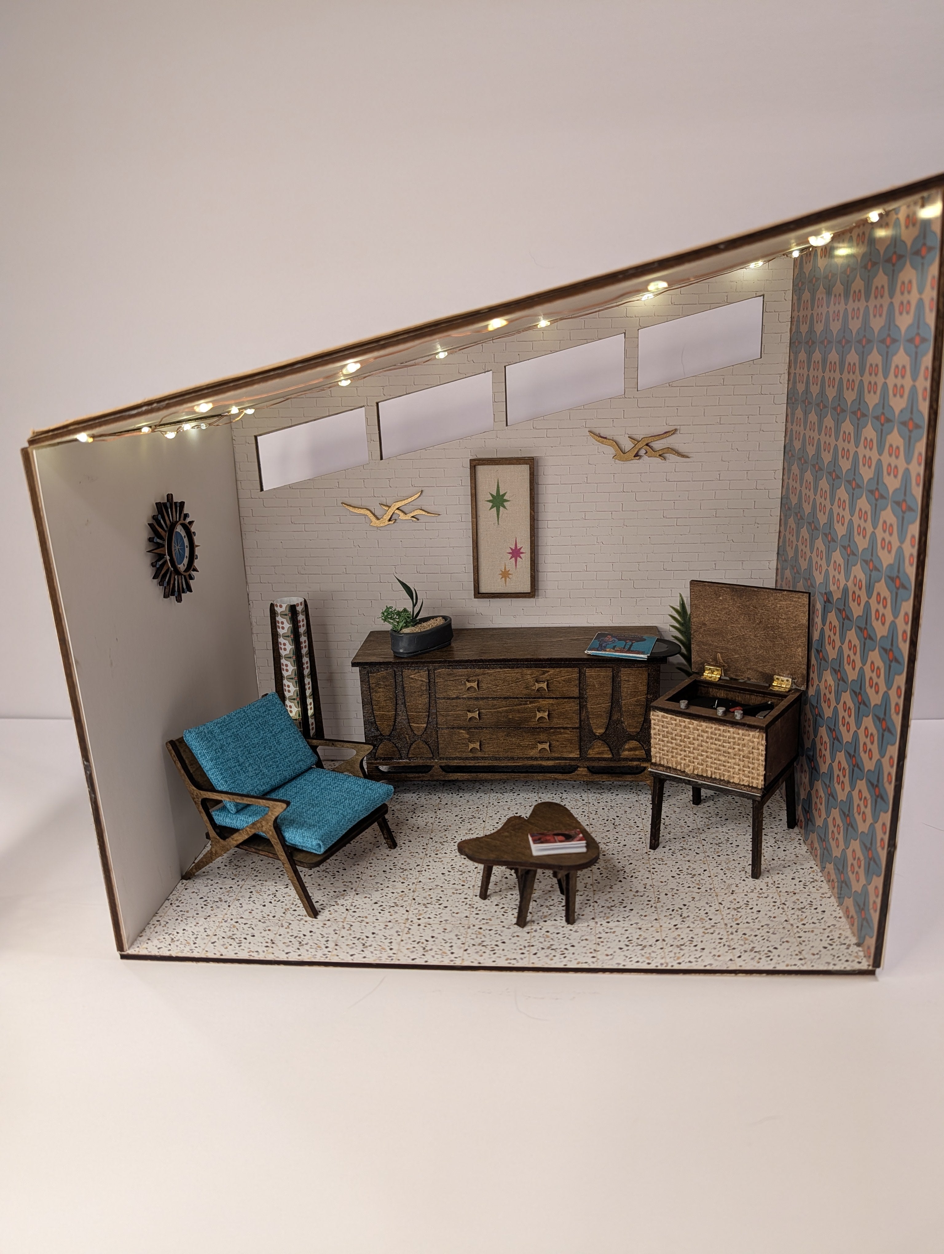 Curved MCM Arm Chair - Miniature 1:12 Scale - dollhouse chair, room box chair, mid-century miniature decor, diorama decor