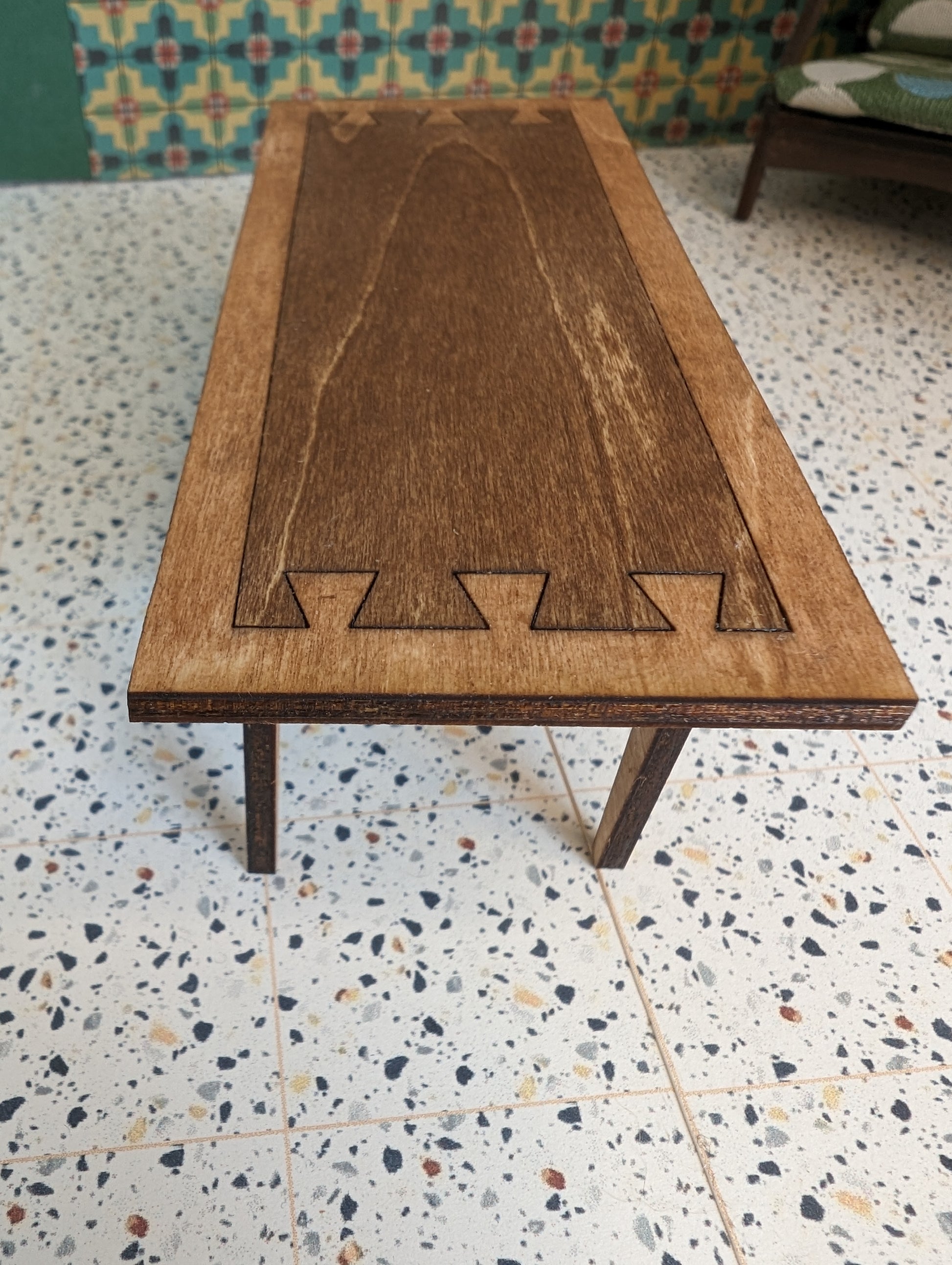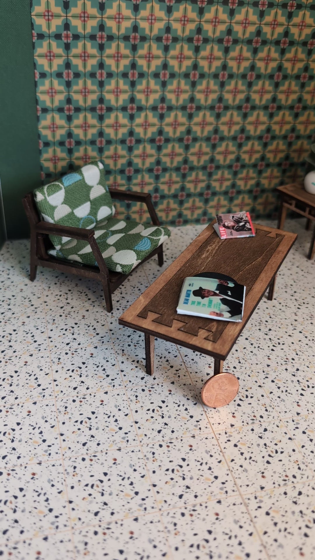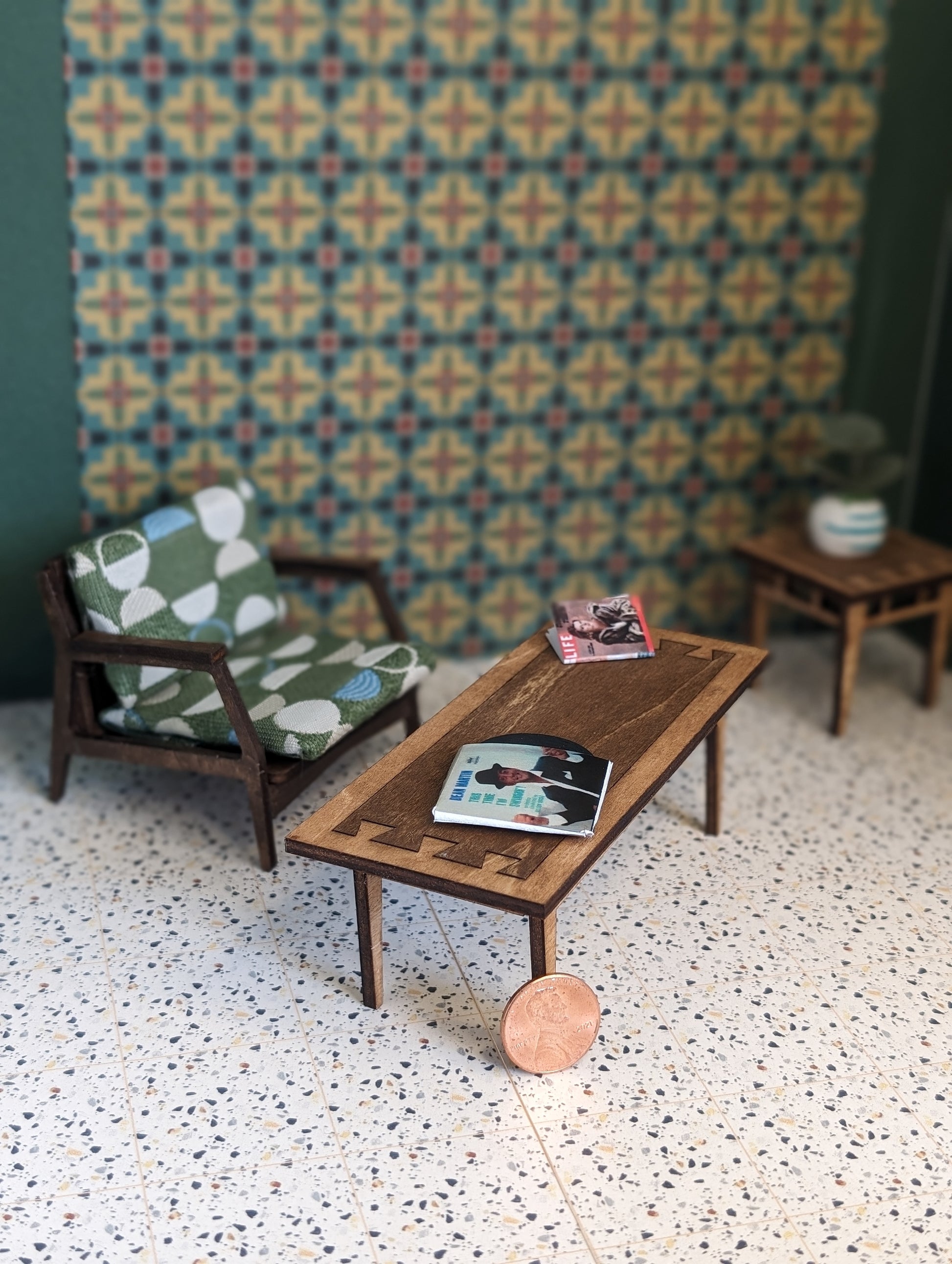 The Lane "Acclaim" Walnut and Ash Coffee Table is a mesmerizing 1:12 scale miniature masterpiece that encapsulates the mid-century modern charm of the iconic Lane Acclaim collection. Immerse yourself in the allure of timeless design with this meticulously crafted miniature, destined to elevate your dollhouse, diorama, or miniature scene to new heights of sophistication.