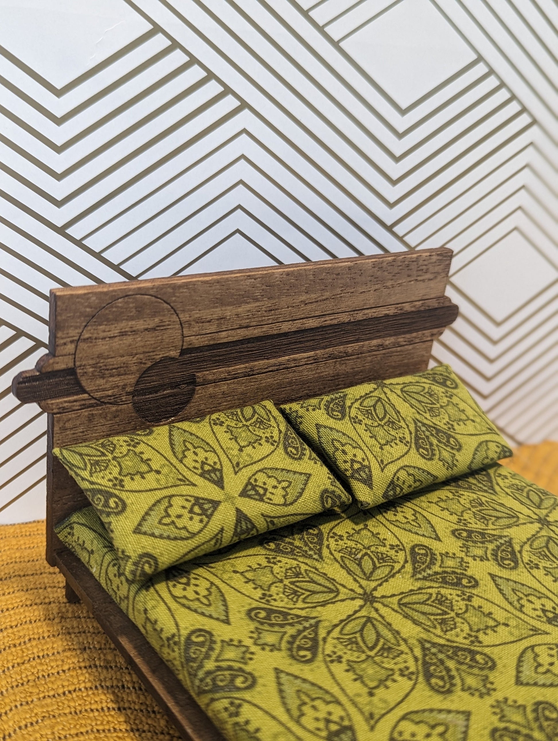 This platform bed frame features a sleek silhouette with tapered legs, characteristic of mid-century design, and the headboard is adorned with etched circles, creating a visually captivating focal point. This scaled-down version is ideal for dollhouses, dioramas, or collector displays, adding a touch of vintage sophistication and artistic flair to your miniature setting.