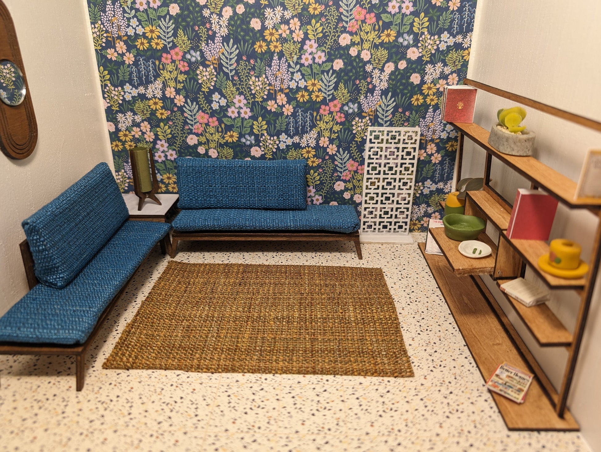 Transform your dollhouse into a stylish mid-century haven with our meticulously crafted miniature Mid Century Sectional Sofa & Side Table Set. This exquisite set is perfect for dollhouse enthusiasts and collectors seeking to add a touch of vintage charm and modern elegance to their miniature worlds.