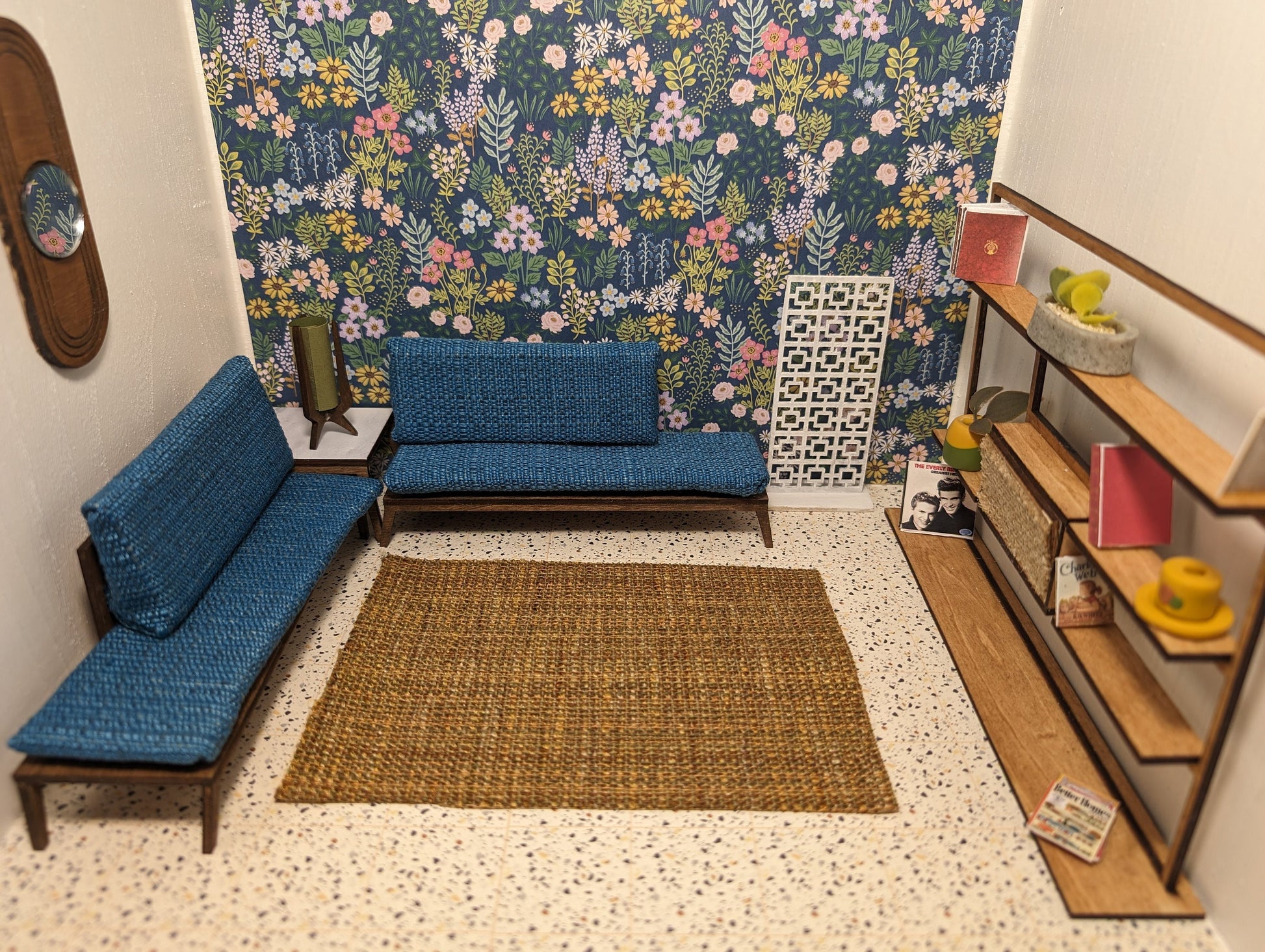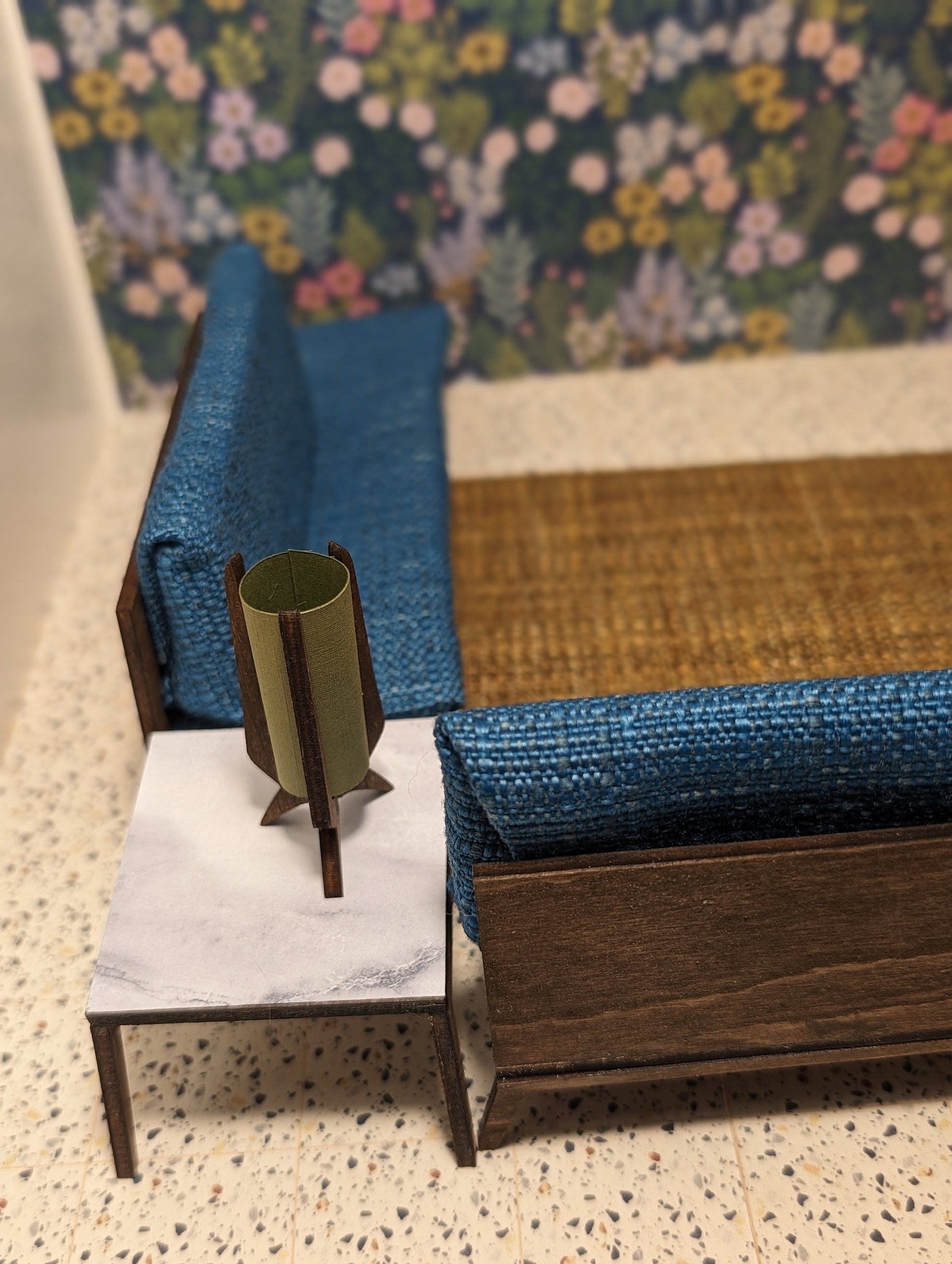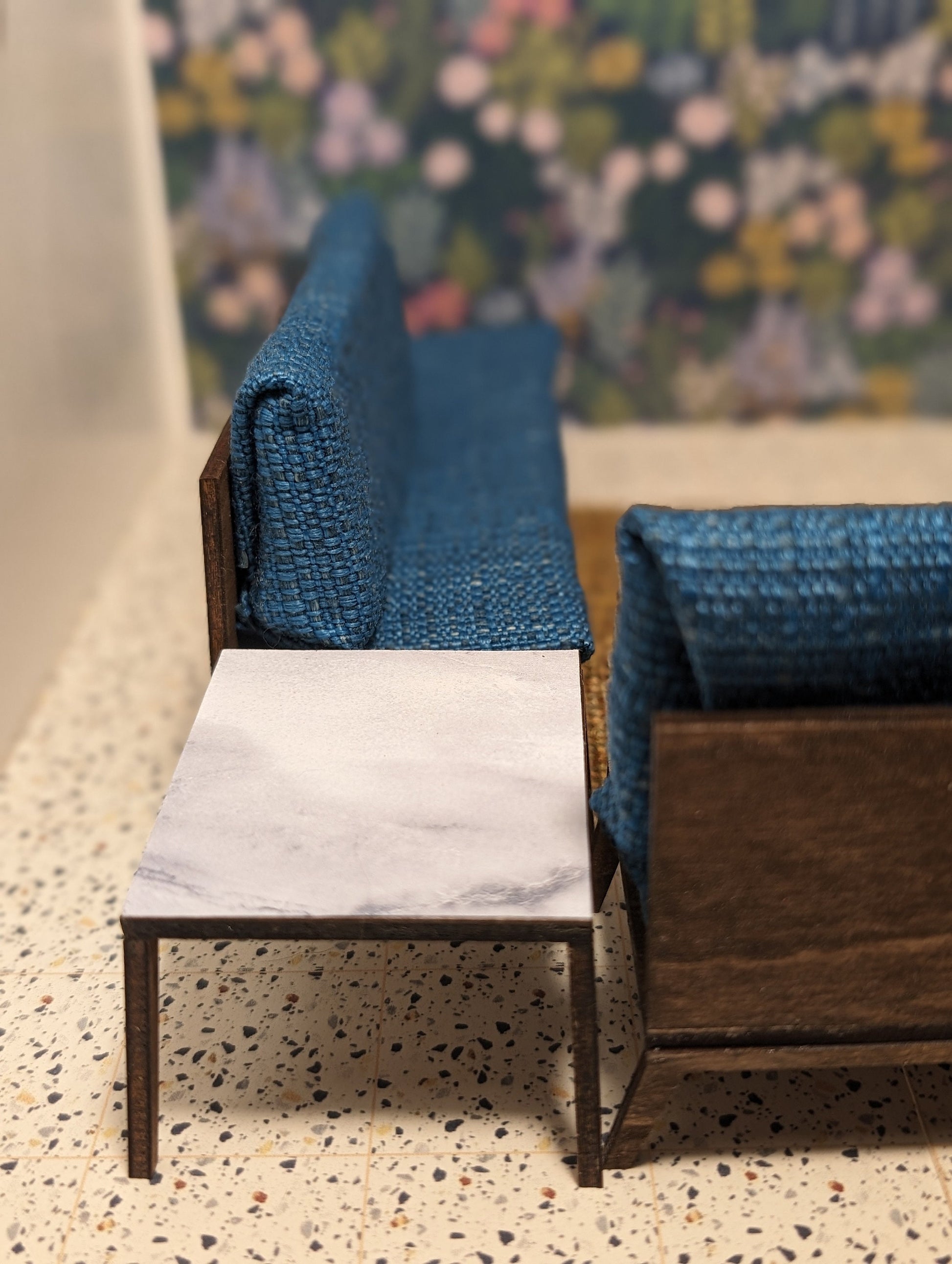 Mid Century Sectional Sofa & Side Table Set - Miniature 1:12 Scale; Room Box; Dollhouse Decor